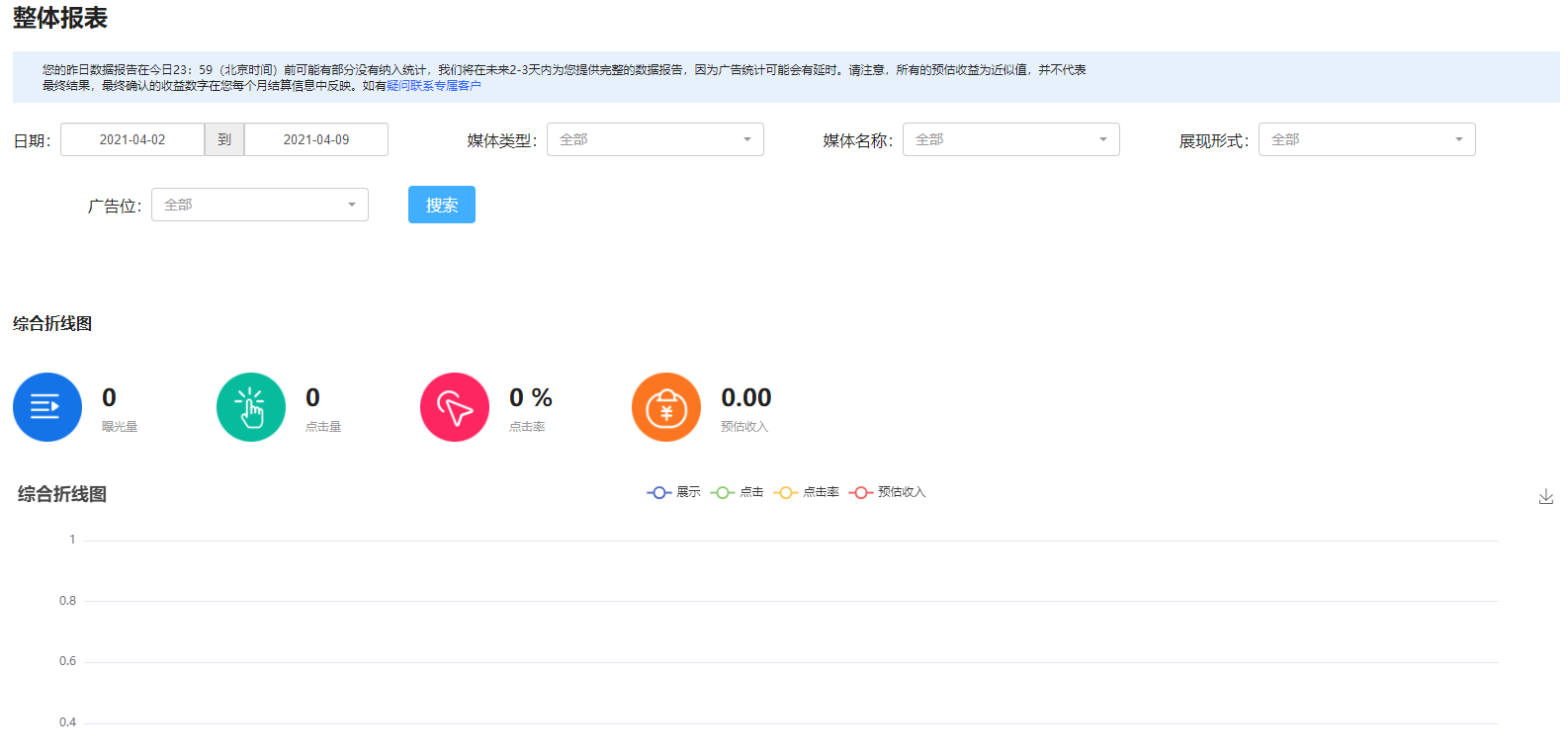SSP平台用户首页为您简洁直观的呈现您的收入与广告效果数据。首页不仅提供多种统计数据信息,同时提供图表功能,方便您查看趋势和比较重要数据指标。