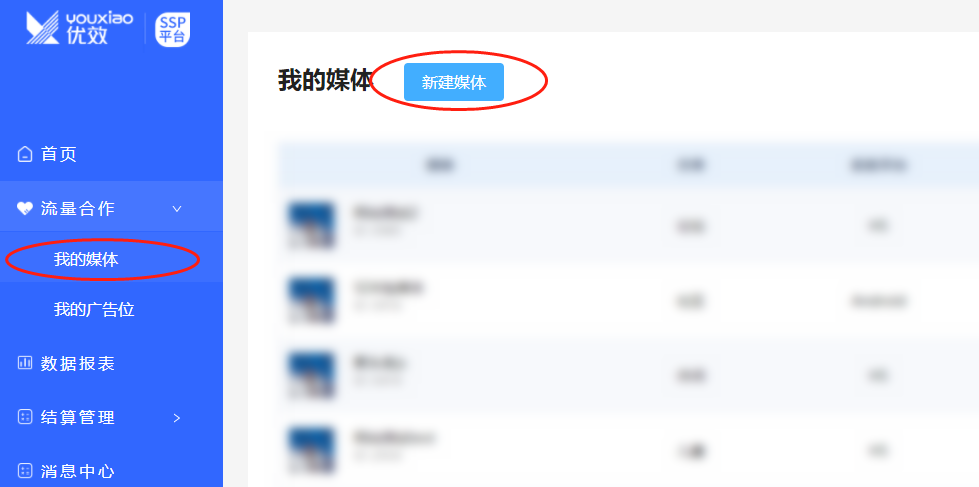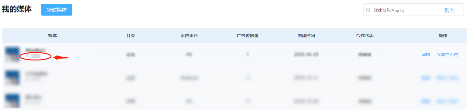 添加媒体:请在 “流量合作->我的媒体”中,新建对应的媒体,获取媒体ID。