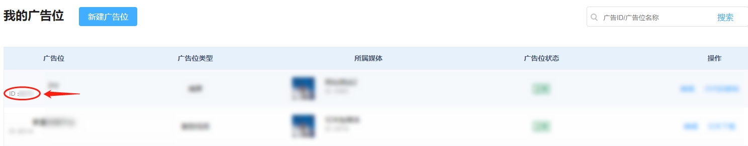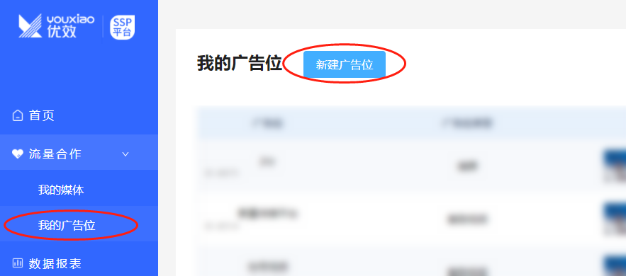 添加广告位:请在 “流量合作->我的广告位”中的广告位管理新建广告位,获取广告位ID。