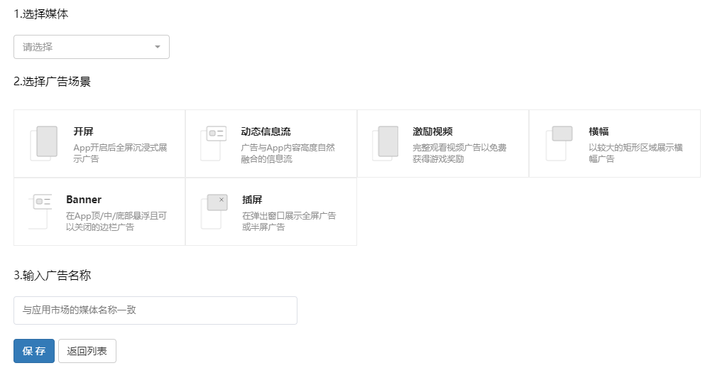 这里需要注意的是,所属媒体和广告位类型一旦保存后不可修改,如果确实要修改,需要删除后重新创建。